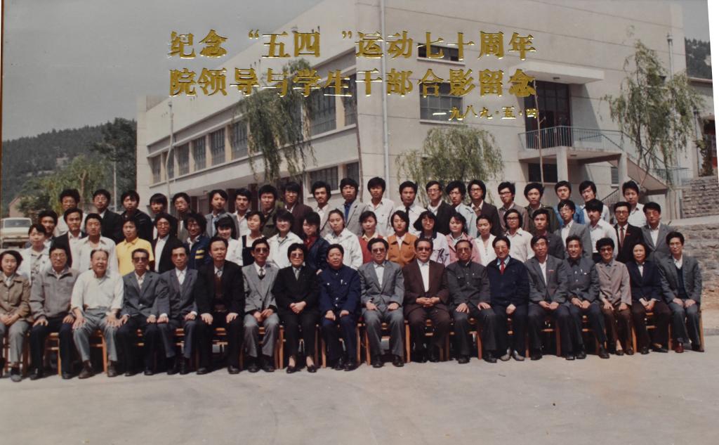 原山东财政学院1989年纪念“五四”运动七十周年学院领导与学生干部合影(前排左起第五位为投资经济系首任主任陈文思)