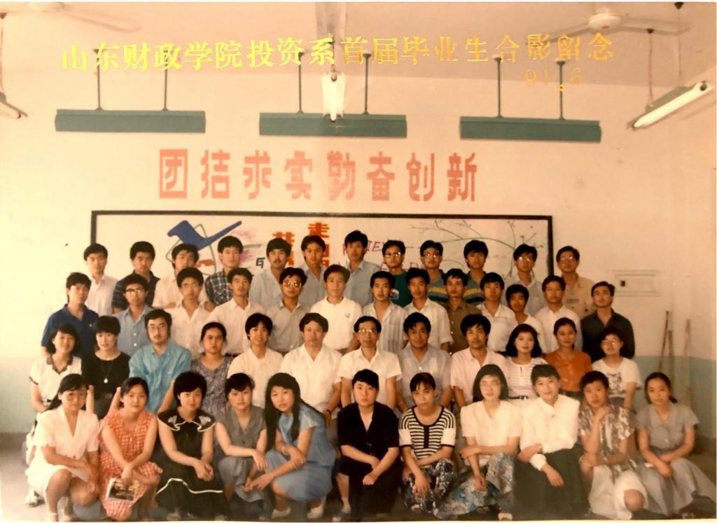 1991年6月,原山东财政学院投资经济系首届毕业生毕业合影(二排左起第六为时任投资系党总支书记戴彦福,第七为系主任陈文思)