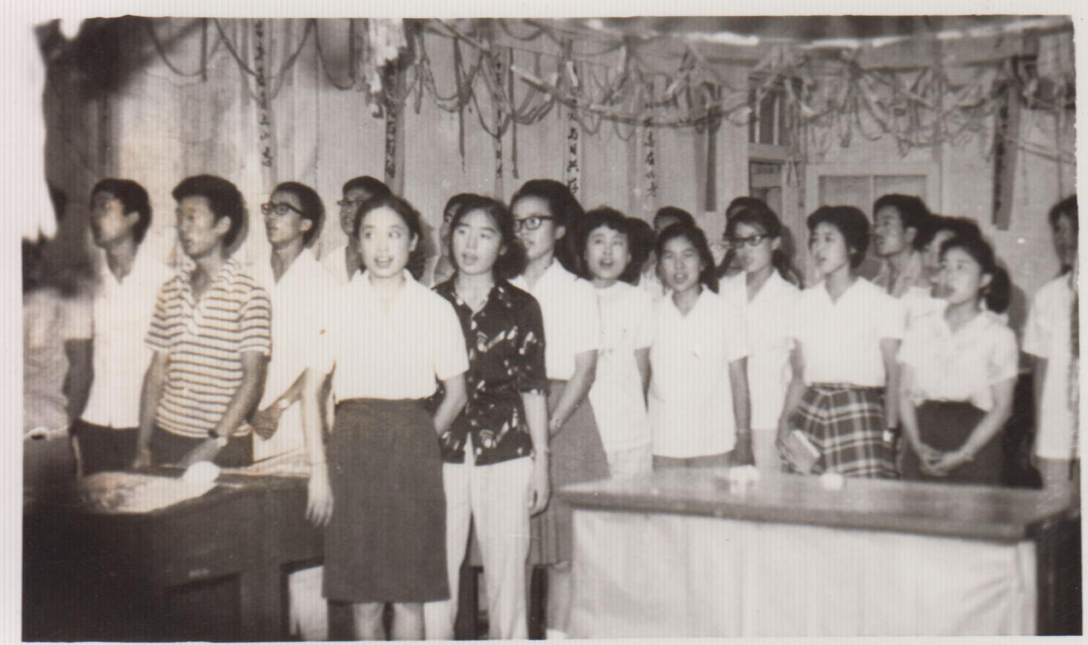 1984年6月,山东经济学院财政金融系80级学生毕业晚会共唱“年青的朋友来相会”